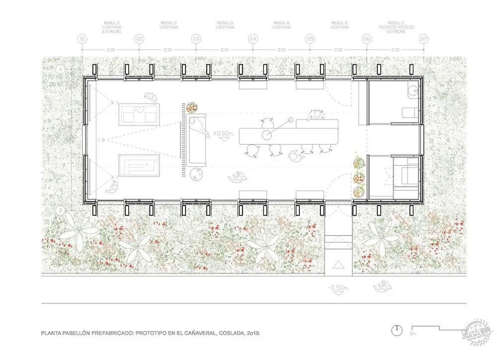 與未定義區(qū)域的高效能量反饋。由于項目的地點位置,展館因此需要能夠適應(yīng)任何場地和形態(tài),建筑師在地面層設(shè)計了適應(yīng)性基礎(chǔ)系統(tǒng),其外部元素也依據(jù)各種氣候因素進行布局。
