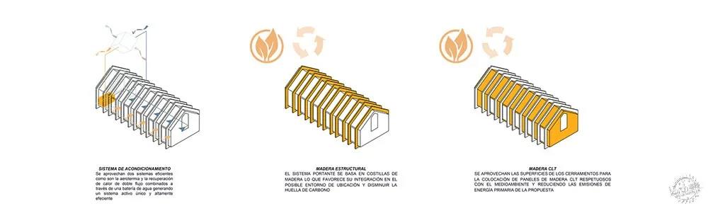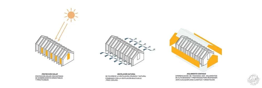 全球化設(shè)計以減少需求為基礎(chǔ),注重節(jié)能標(biāo)準(zhǔn),建筑師應(yīng)用了許多被動式策略,其中包括緊湊連續(xù)的隔熱系統(tǒng)、適應(yīng)性太陽能保護體系、動態(tài)負(fù)荷控制或自然通風(fēng)體系。在高峰需求時,項目的目標(biāo)是在5/7天的10/24小時中實行連貫的積極策略,將消耗降至最低。除此之外,建筑師還在整個項目中結(jié)合應(yīng)用空氣熱能和雙流熱焓回?zé)崞鳎@可以通風(fēng)與控制溫度,另外再利用空氣熱能和地暖來減少耗能。
