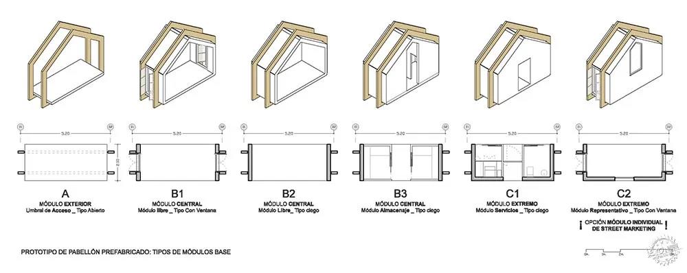這是一個靈活重配置的工業(yè)體系。預(yù)制展館原型基于標(biāo)準(zhǔn)模塊的多種形式,是靈活多變的體系。這種模塊化附加類型項目可以根據(jù)不同的項目需求進行配置,其中包括大型博物館大廳和小規(guī)模辦公室等多種組合。